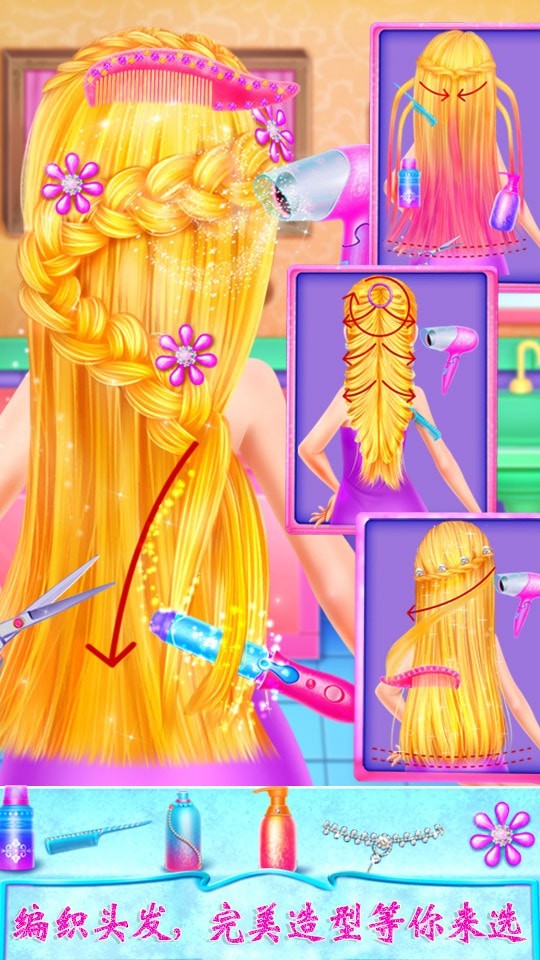 2.游戏从最基本的护理入手,涵盖面部清洁、补水、去角质等步骤。您可以为长发公主和其他角色进行专业化妆,包括选择合适的粉底、腮红、眼影、眼线、唇彩等。每一个细节都可以精细调整,确保每一种妆容多样且合适。游戏还提供了发型设计、服装搭配等环节,让玩家在一个充满创意和色彩的世界中尽情挥洒自己的才华。